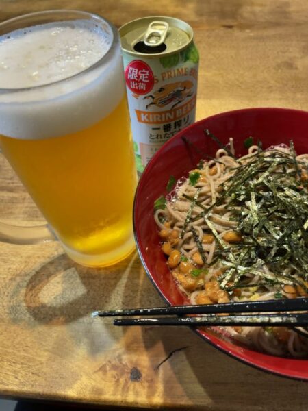 自宅に戻ってからは、ビールで水分補給しつつお蕎麦をいただきましたよ